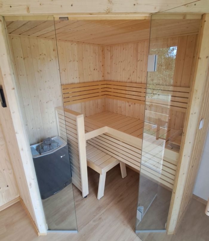 Gefertigt aus hochwertigem Fichtenholz, verleiht sie deinem privaten Wellnessbereich eine elegante und zeitlose Atmosphäre. Die große Glasfront lässt viel Tageslicht hinein und sorgt für ein offenes, einladendes Raumgefühl.