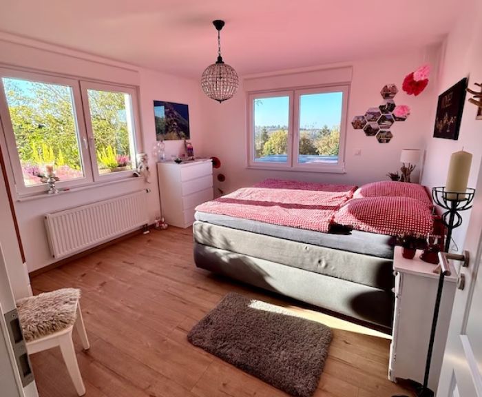 Das Schlafzimmer bietet dir ein gemütliches Boxspringbett (1,80 x 2,00 m) mit hochwertigem Emma Diamond Degree Topper – frisch bezogen und inklusive Kopfkissen, Bettdecken und Bettlaken.