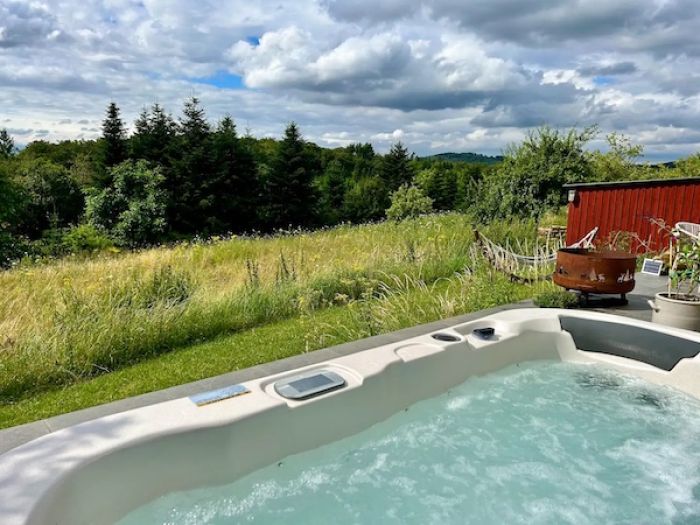 Die extra große Terrasse, die du direkt vom Wohnzimmer aus erreichst, bietet dir rund um die Uhr völlige Privatsphäre: Der beheizte und beleuchtete Whirlpool sowie der Weber-Gasgrill stehen dir jederzeit zur freien Nutzung zur Verfügung. Ein Tisch mit vier Stühlen, viel Grün und ein weiter Blick in die Natur sorgen für pure Entspannung.